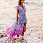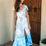 Feel free and fresh in our Luana Long dress made from ultra-soft Rayon. Individually hand-dyed in a dreamy soft cloud print, with button-down front and hand-embellished detail, for an elegant edge.The angel sleeves and sexy front slit cultivate a divine and sultry synergy for the goddess in you. Choose from two stunning shades of Pink or Blue.